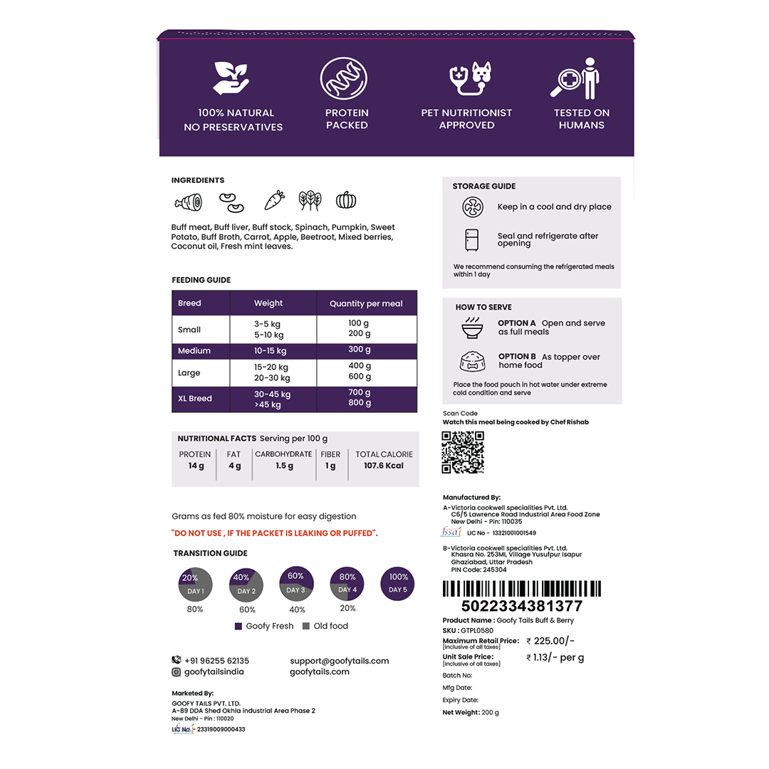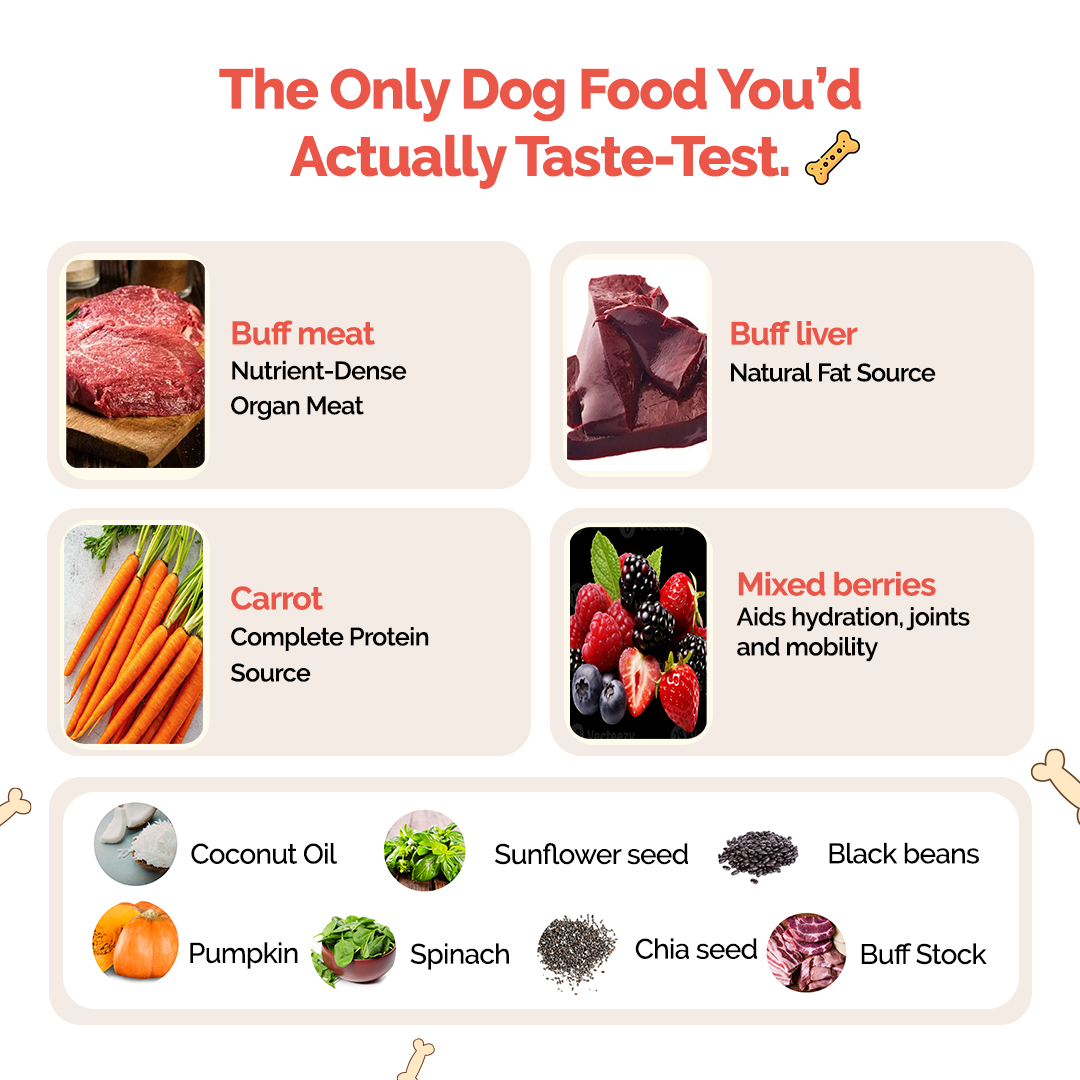 “Best thing about goofy tails is how they try to reach pups taste buds correct. Buff and berry are a perfect product for you pups as it has fresh ingredients and best part is it's READY to eat. if you're travelling with your pups, this is a go-to product you should have.👌👌”