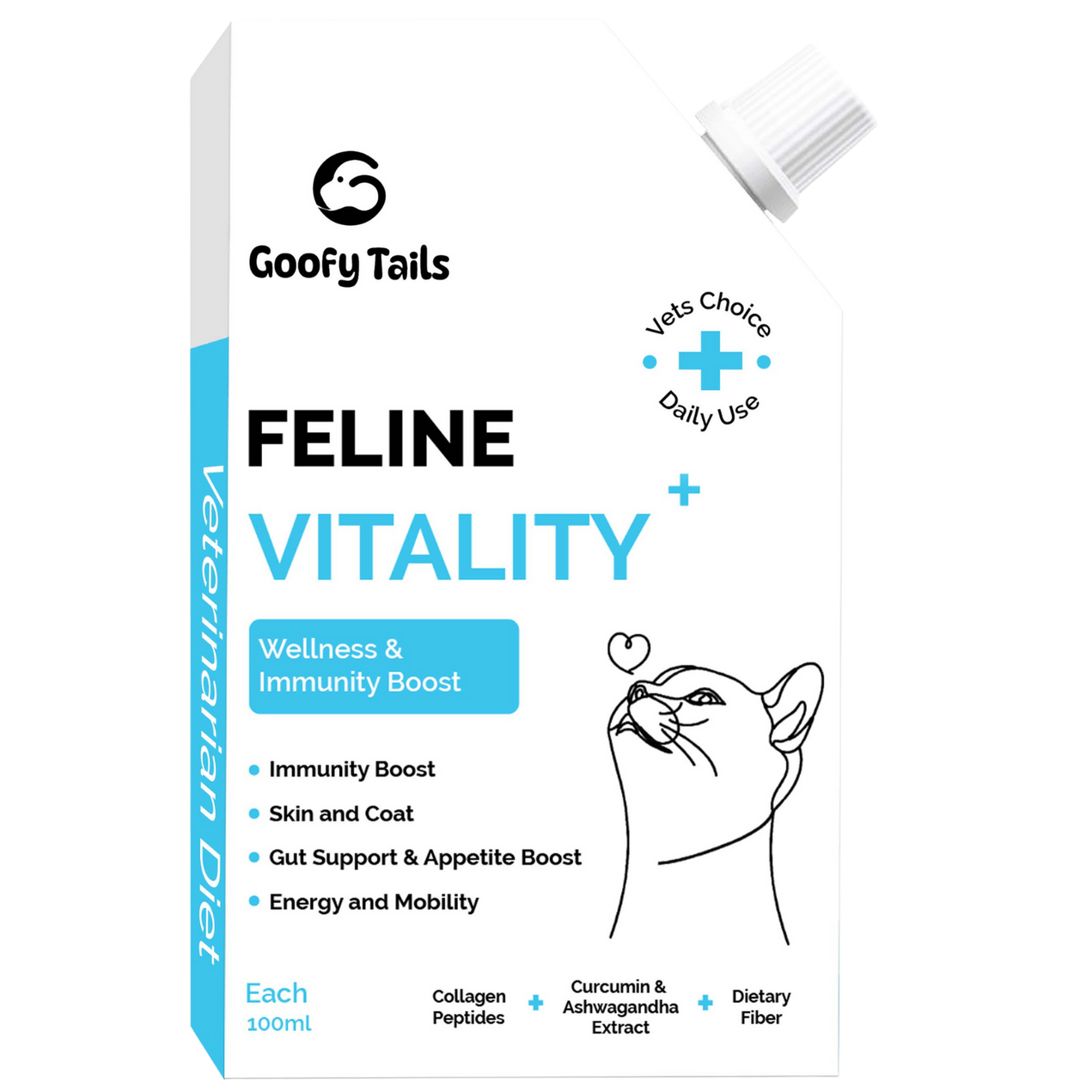Support your cat’s health with Goofy Tails Feline Vitality+ — a nutritious daily supplement topper for dogs! Designed to energise and protect, this exclusive wellness formula is packed with natural ingredients that promote immunity, joint strength, digestion, and healthy skin. Whether your cat is highly active or just needs a little extra support, Feline Vitality+ is a convenient and tasty way to enhance every meal. Just pour it over your cat’s meals and let them enjoy a delicious boost of vitality. Crafted for everyday wellness, this supplement is a smart choice for cats of all ages.