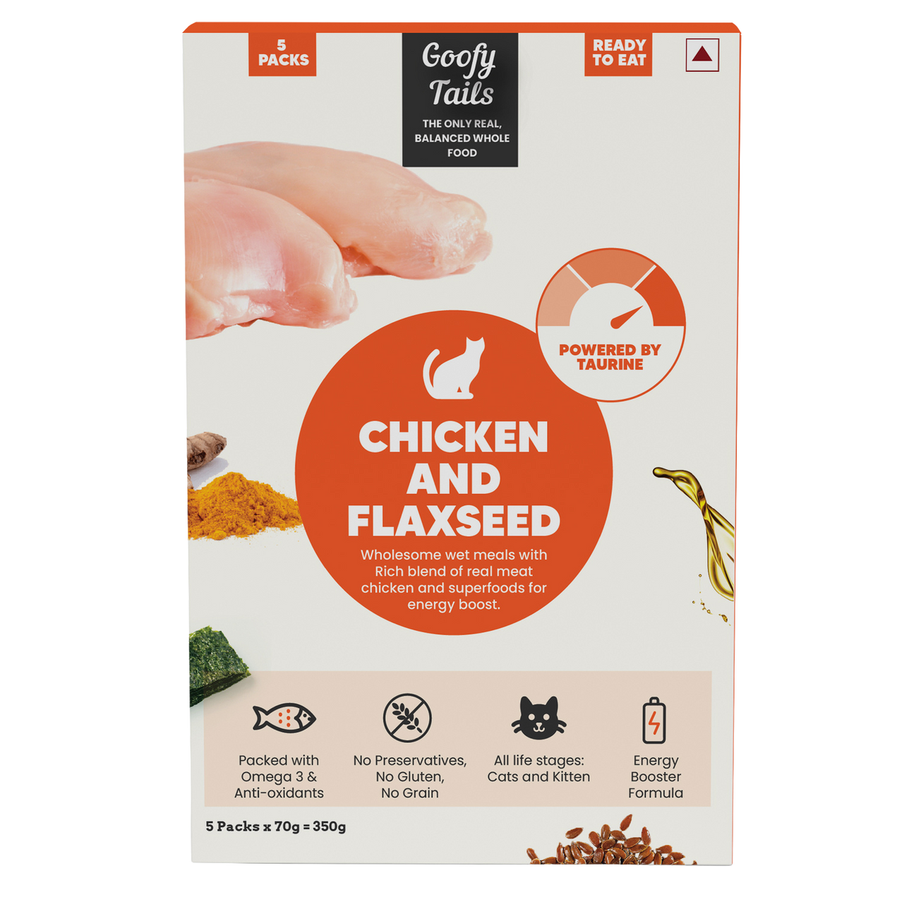 Chicken meat, Water, Sunflower oil, Flaxseed powder, Seaweed extract, Sodium alginate, Vitamin E, Turmeric