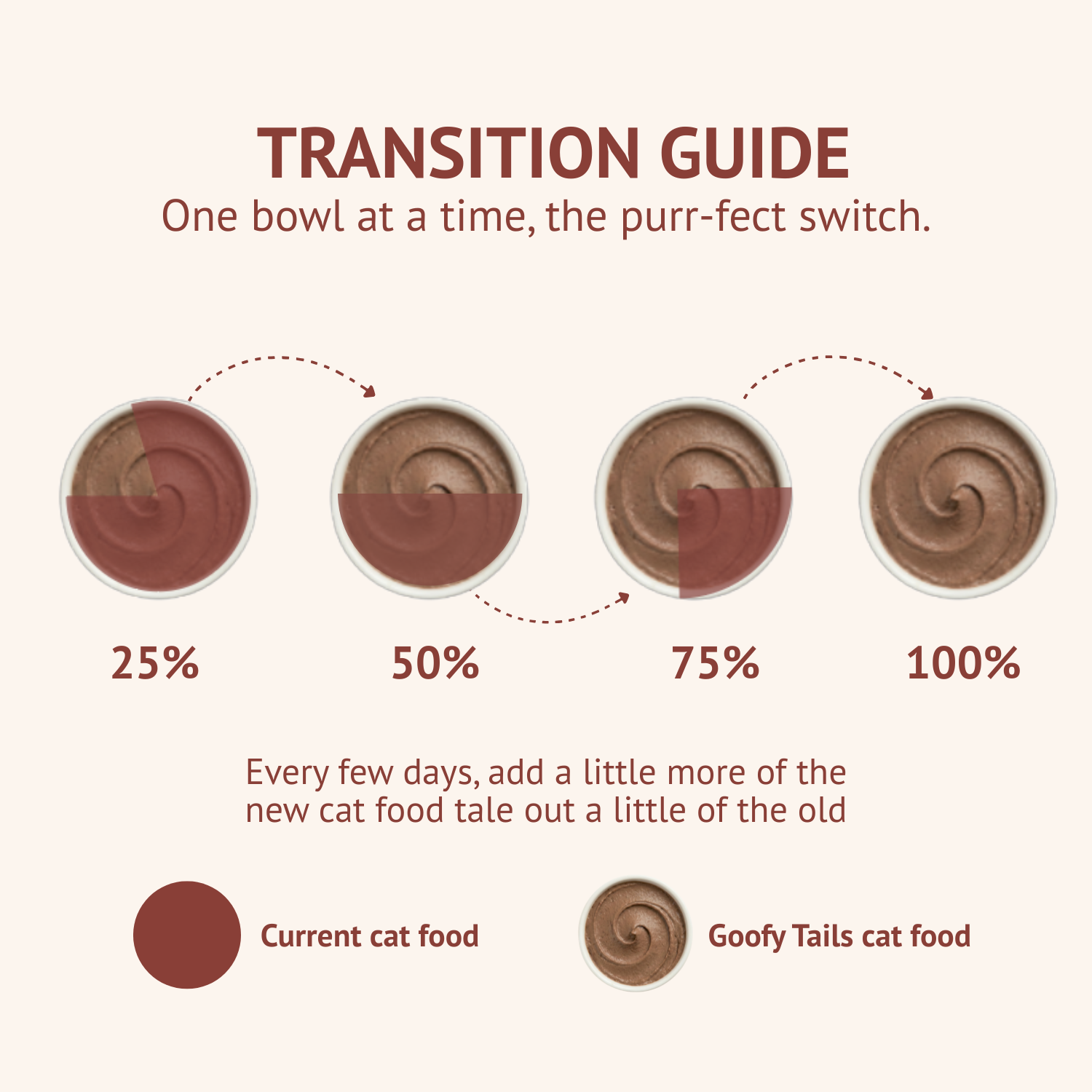 It's always best to gradually introduce the new Cat food over a 7 day period to avoid digestive upsets. Reduce the current food and increase Goofy Tails Wet cat food until you are feeding it exclusively new diet gradually by mixing small amounts of the new food with their usual food for a few days.