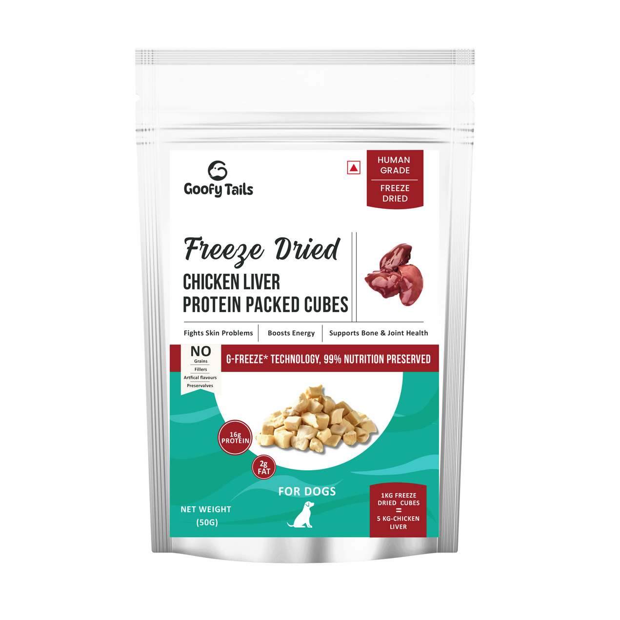 Goofy Tails Freeze-Dried Chicken Liver Cubes are different because they are made using a freeze-drying process that locks in the nutrients, flavor, and aroma of the chicken liver without the use of heat or preservatives. This makes them a more nutritious and natural option compared to regular dog treats.