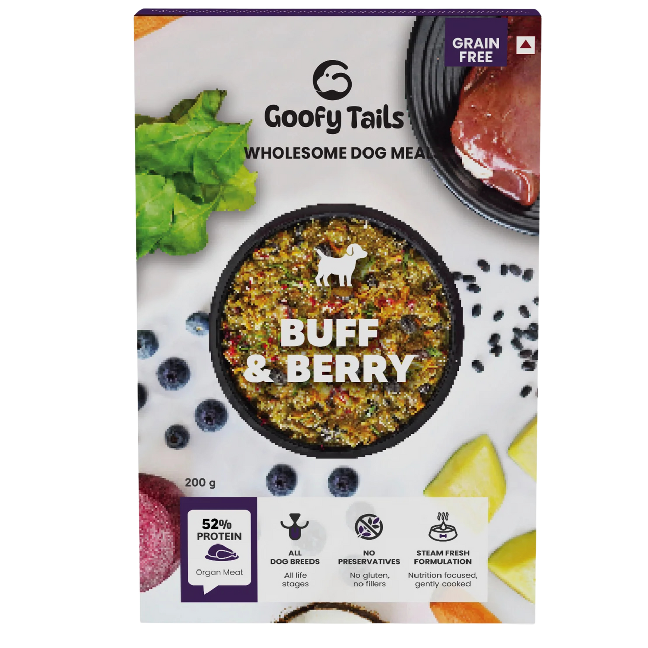 PACKED WITH REAL BUFF MEAT: Goofy Tails Buff & Berry Fresh Food for Dogs is made with real whole food ingredients like Buff meat, Buff liver, Carrot, Pumpkin, Spinach, Mixed berries, Coconut oil, Sunflower seed, Chia seed are cooked in Buff Stock, which is made for maximum nutrient retention & digestion. This meal is power-packed with protein, minerals, and vitamins.
