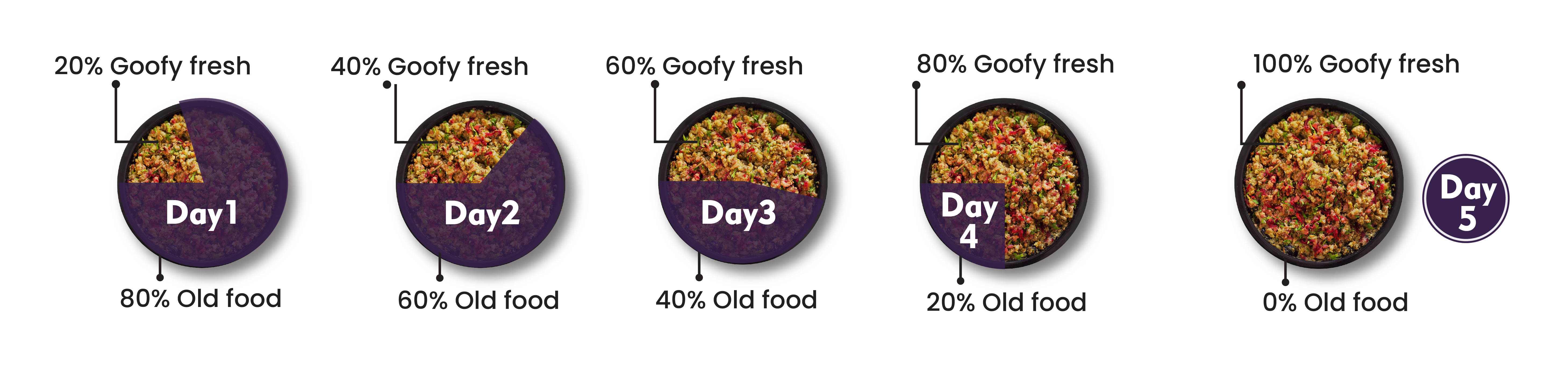 To help your pet adjust smoothly to the new diet, we recommend the following gradual transition over five days: