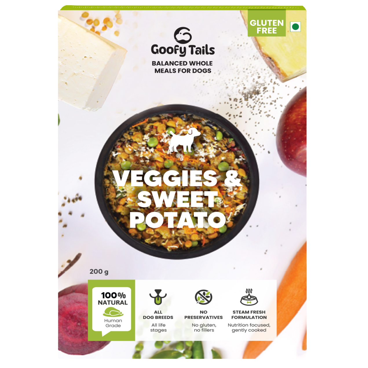Goofy Tails Veggies and Sweet Potatoes Dog Food is a balanced, nutritious meal made with real paneer, yellow lentils, peas, quinoa, sweet potato, and more. Rich in protein, vitamins, and healthy fats, it supports better digestion, shinier coats, and overall health. Crafted by expert chefs and free from common allergens, it’s perfect for dogs of all breeds and ages. Gradually mix with regular food for a smooth transition to fresh, human-grade dog meals.