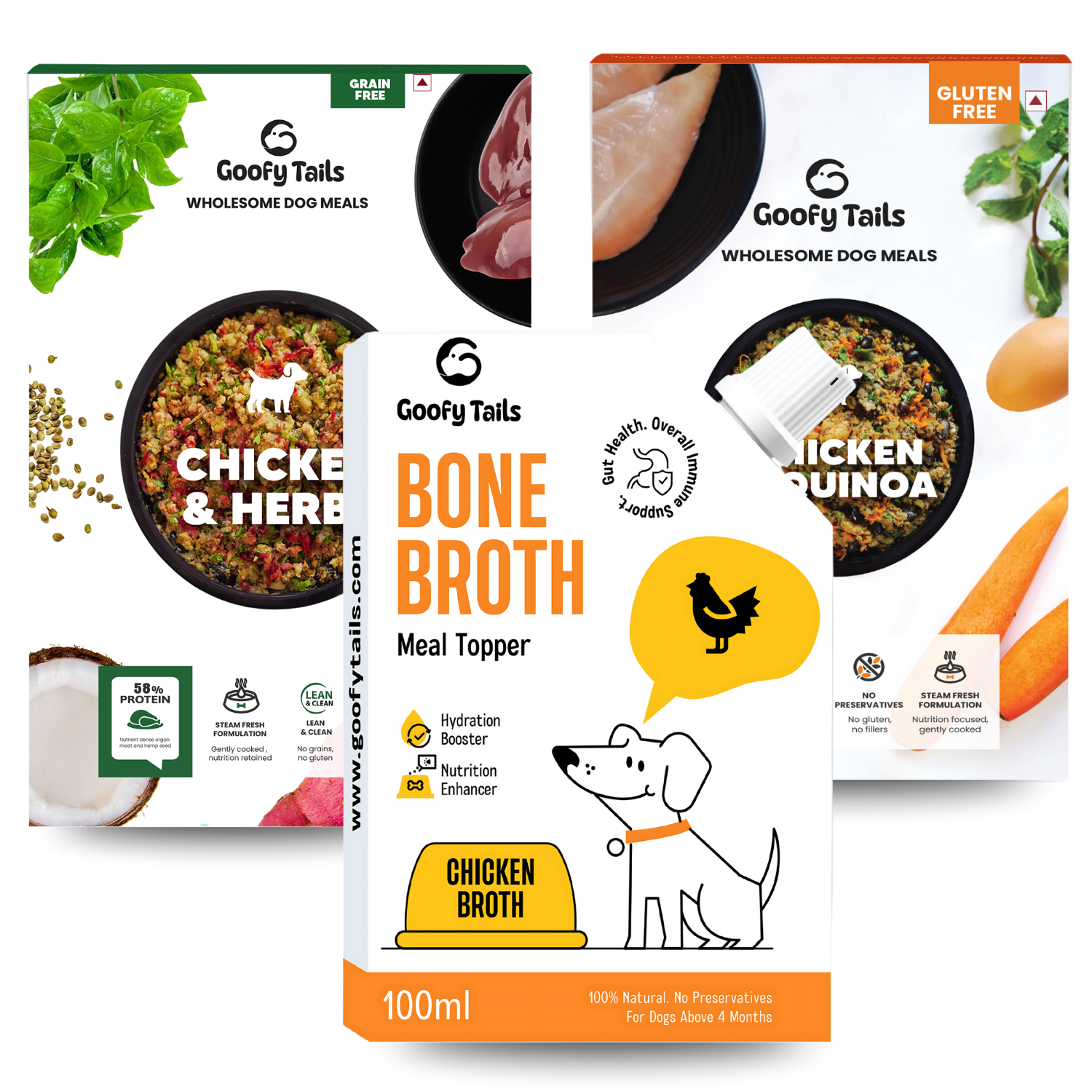 Goofy Tails Trial Pack Meals and Broth Combo (Chicken & Quinoa+ Chicken & Herbs+ Chicken Bone Broth)