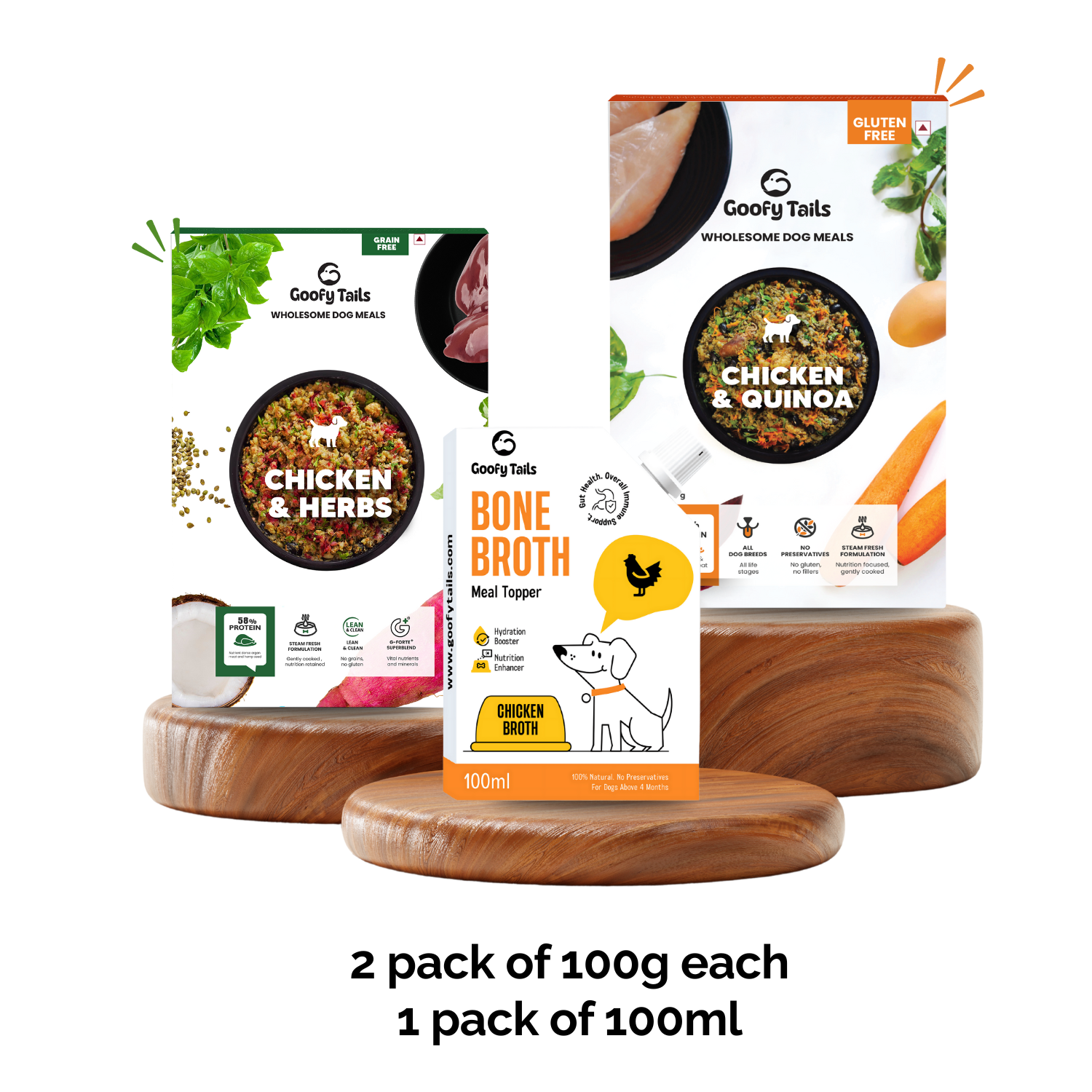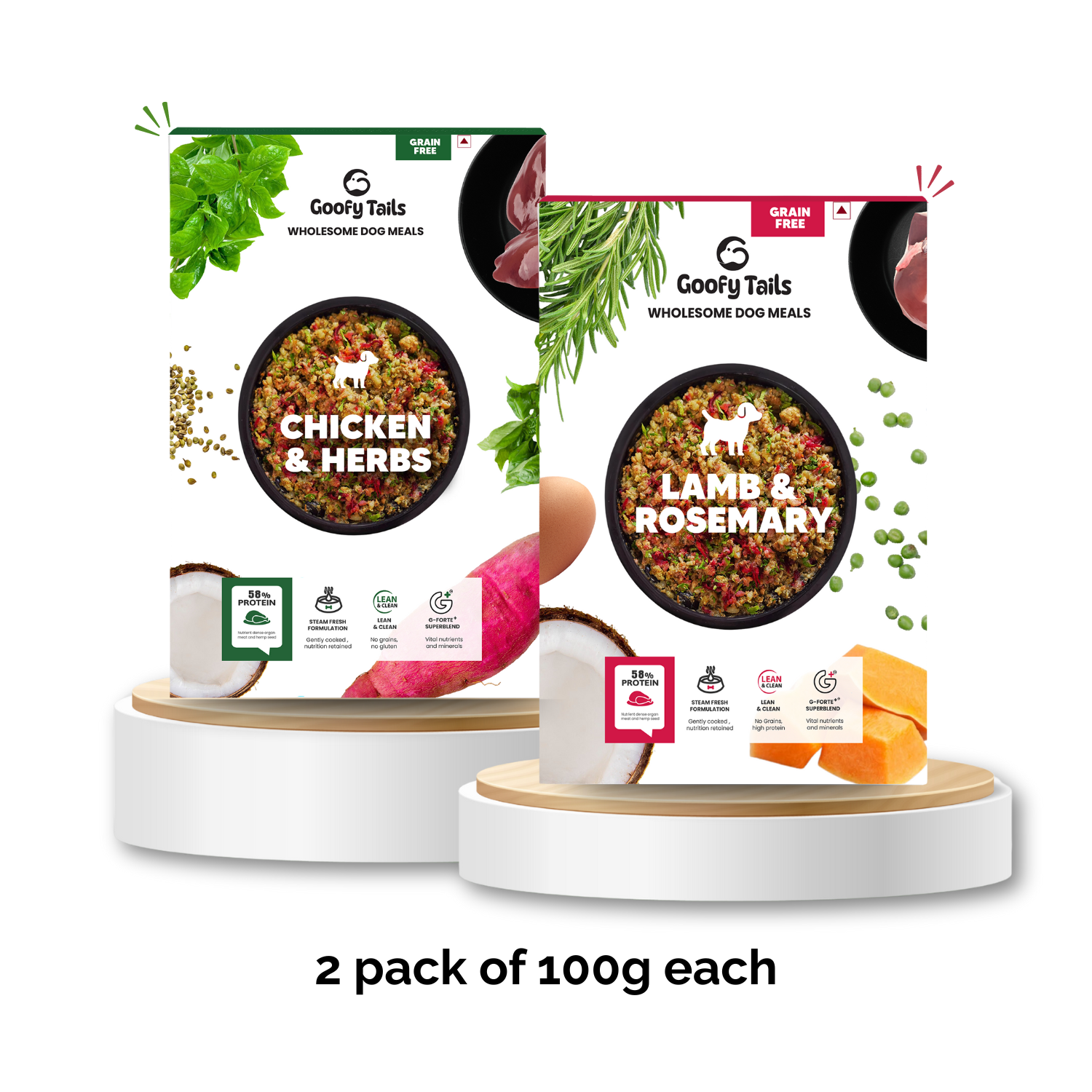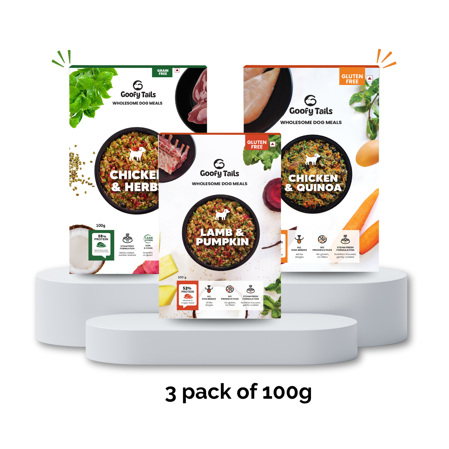 Chicken & Quinoa, Chicken & Herbs, and Lamb & Pumpkin