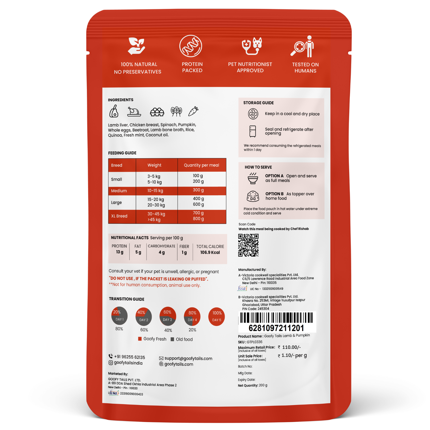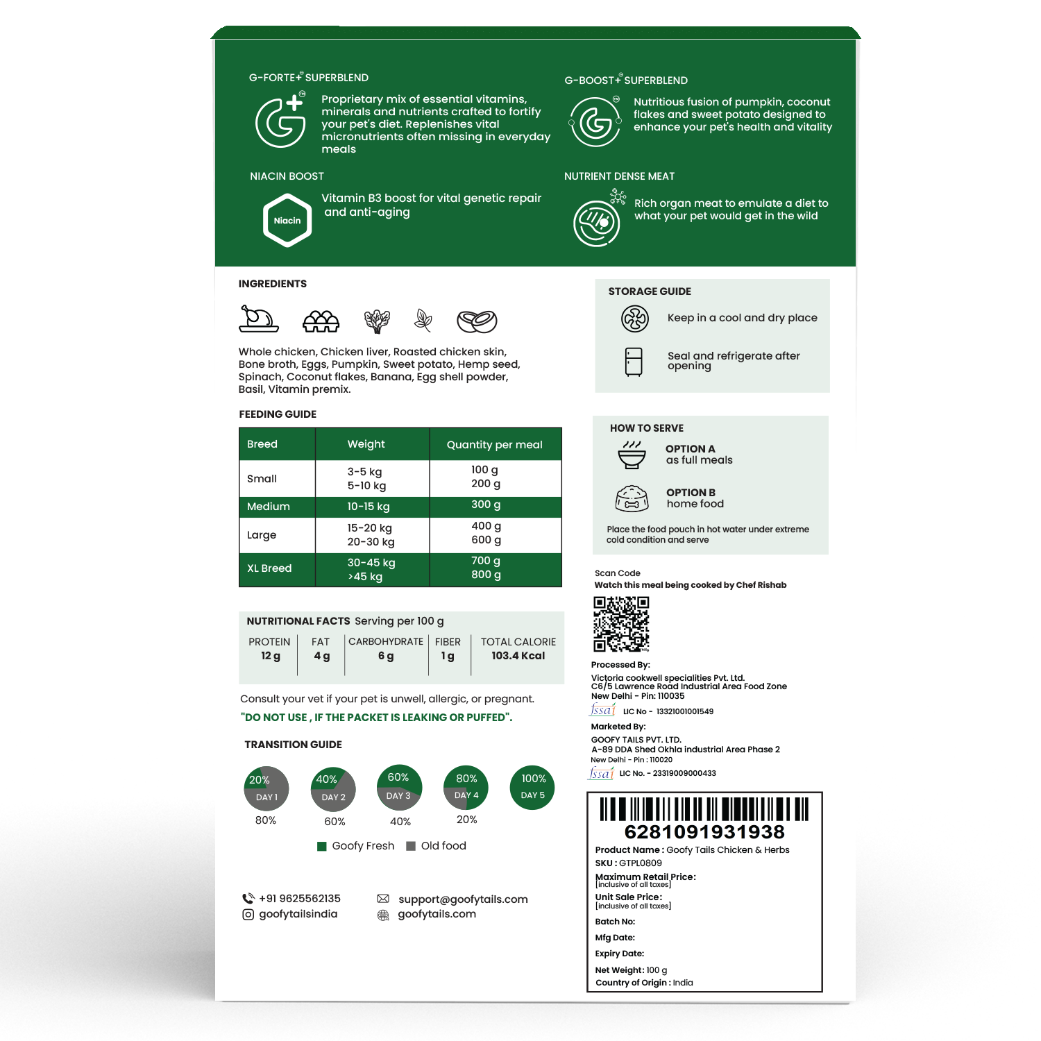 Give your dog the best of nutrition and taste with Goofy Tails’ Trial Pack Dog Meals, featuring Chicken & Quinoa, Chicken & Herbs, and Lamb & Pumpkin. Each recipe is crafted with real meat, nutrient-rich superfoods, and cooked in chicken bone broth for wholesome goodness. Packed with high-quality protein, omega fatty acids, and natural antioxidants, these gluten-free meals support digestion, immunity, skin, coat, and joint health. 100% natural, preservative-free, and ready to serve — a perfect way to discover your dog’s favourite Goofy Tails meal!