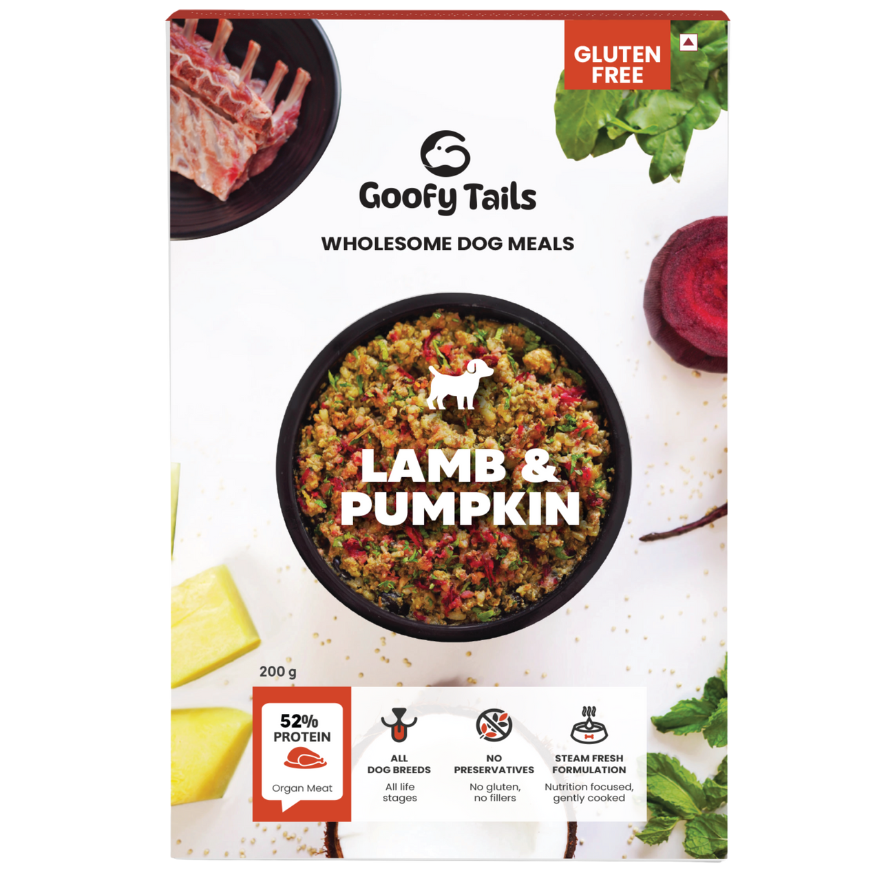 PACKED WITH REAL LAMB: Goofy Tails Lamb and Pumpkin wet dog food is made with real whole food ingredients like Lamb Liver, Chicken Breast, Whole Eggs, Quinoa, Rice, Spinach, Pumpkin, Beetroot, Fresh Mint, Coconut Oil, and Lamb Bone Broth which is made for maximum nutrient retention & digestion. This meal is power-packed with protein, minerals, and vitamins.